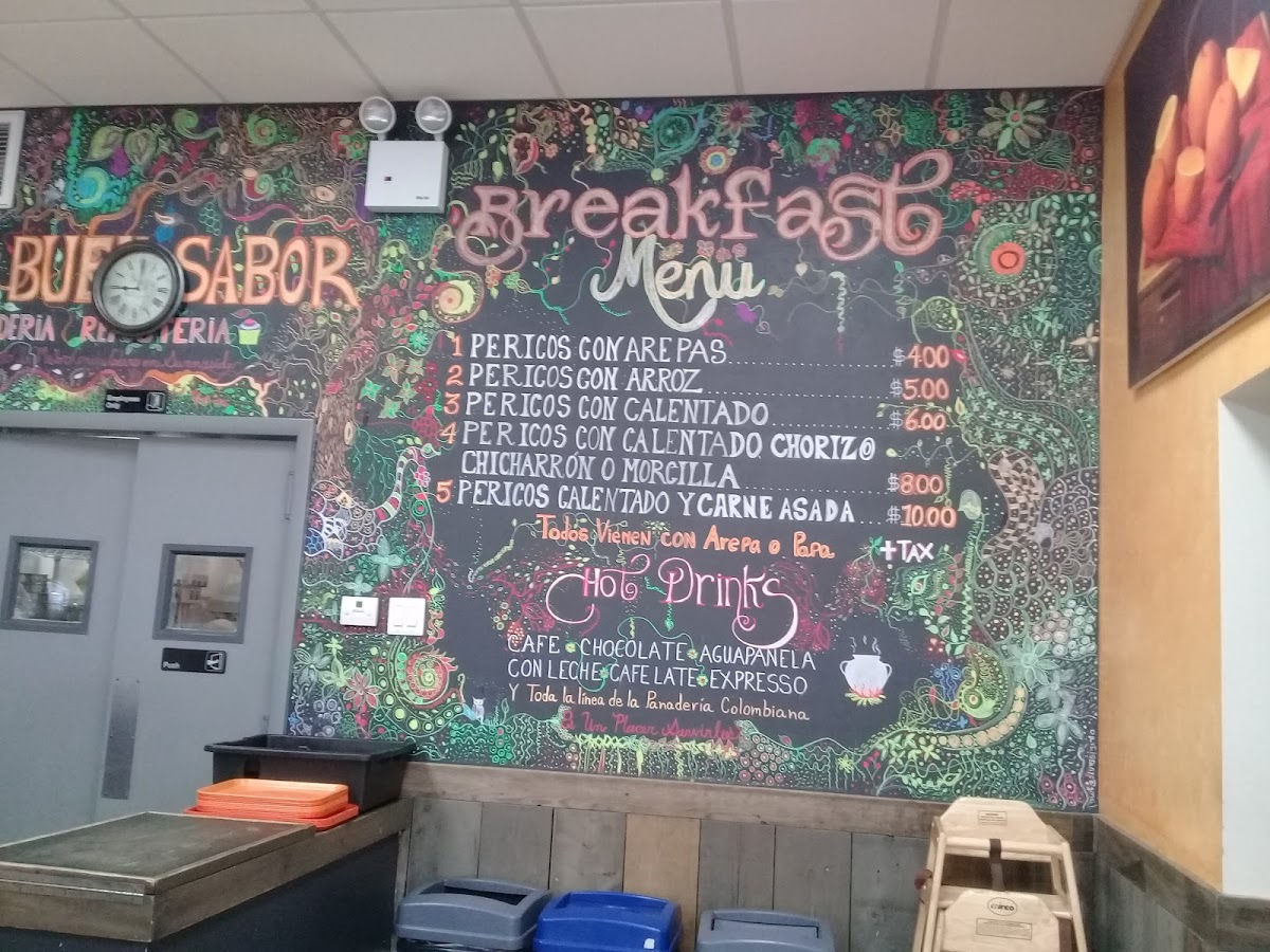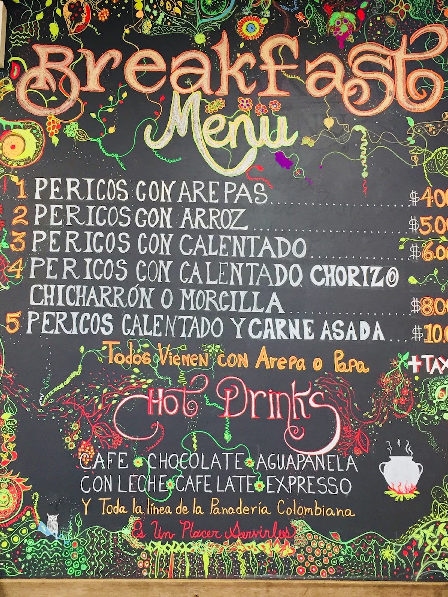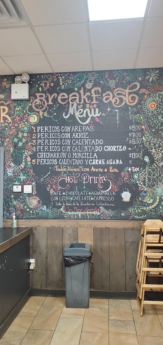 The menu offers a variety of traditional Colombian and Latin American dishes alongside freshly baked goods. It is organized into several key sections to accommodate different dining preferences throughout the day.